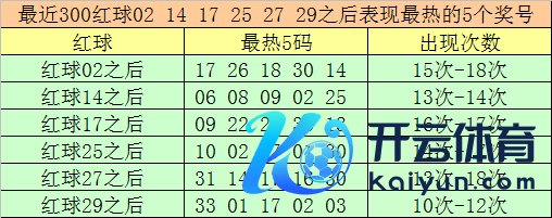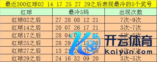 红球冷码统计:双色球第2025072期开出红球奖号辨别为:02、14、17、25、27、29,在最近300期开奖中,各号码出现之后其下期出现最少的5个红球辨别为: