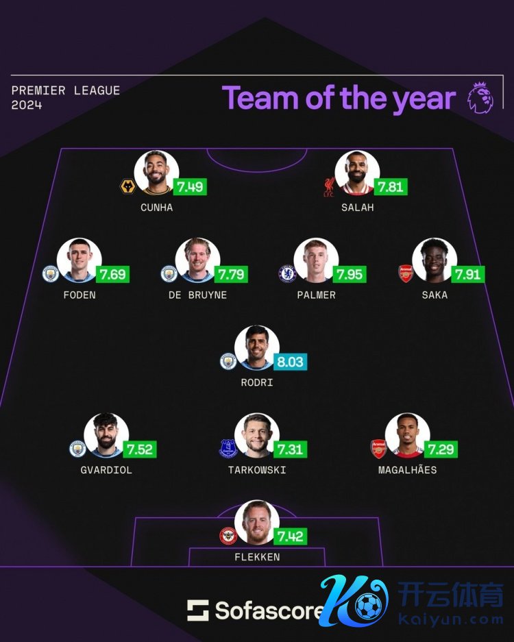 1月1日讯 2025年已至,sofascore也统计了2024年英超年度评分最好气势,曼城4将在列。
