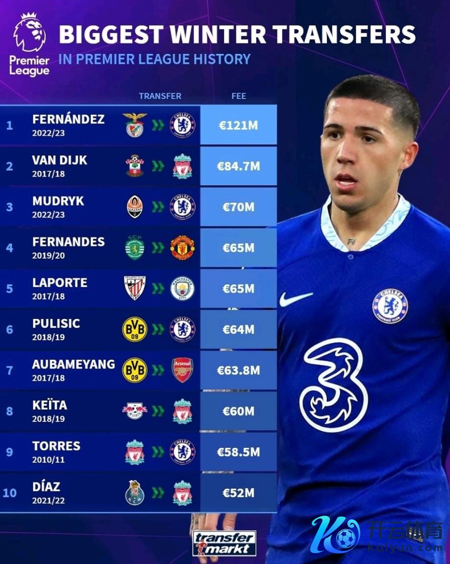 德转列出英超冬季最贵转会TOP10体育集锦,恩佐以1.21亿欧排行榜首,范戴克以8470万欧排第二、穆德里克以7000万欧排第三。