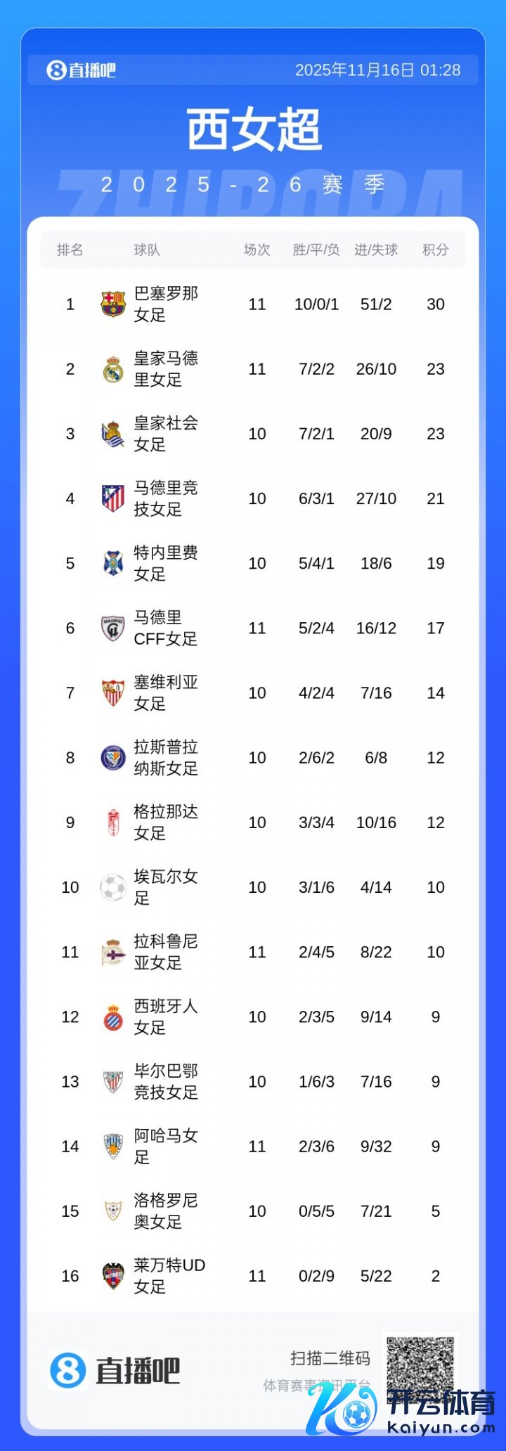 本场比赛后,巴萨女足11轮10胜1负,积30分领跑西女超积分榜。