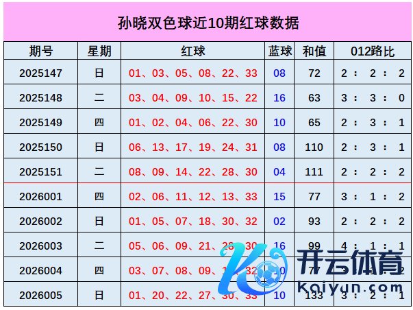 上期归来:双色球第2026005期开出奖号:红球01、20、22、27、30、33;蓝球10,其中红球和值为133,012路比为3:2:1,奇偶比3:3,蓝球开出大偶数号码10。