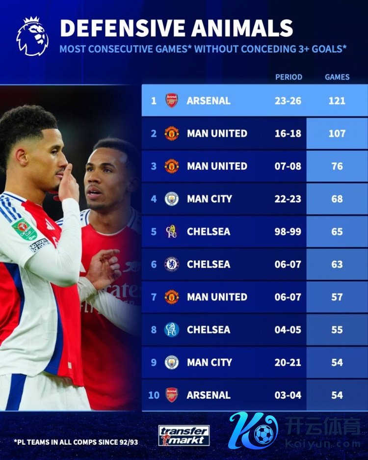 英超球队各项赛事贯穿“单场不丢3球”榜: