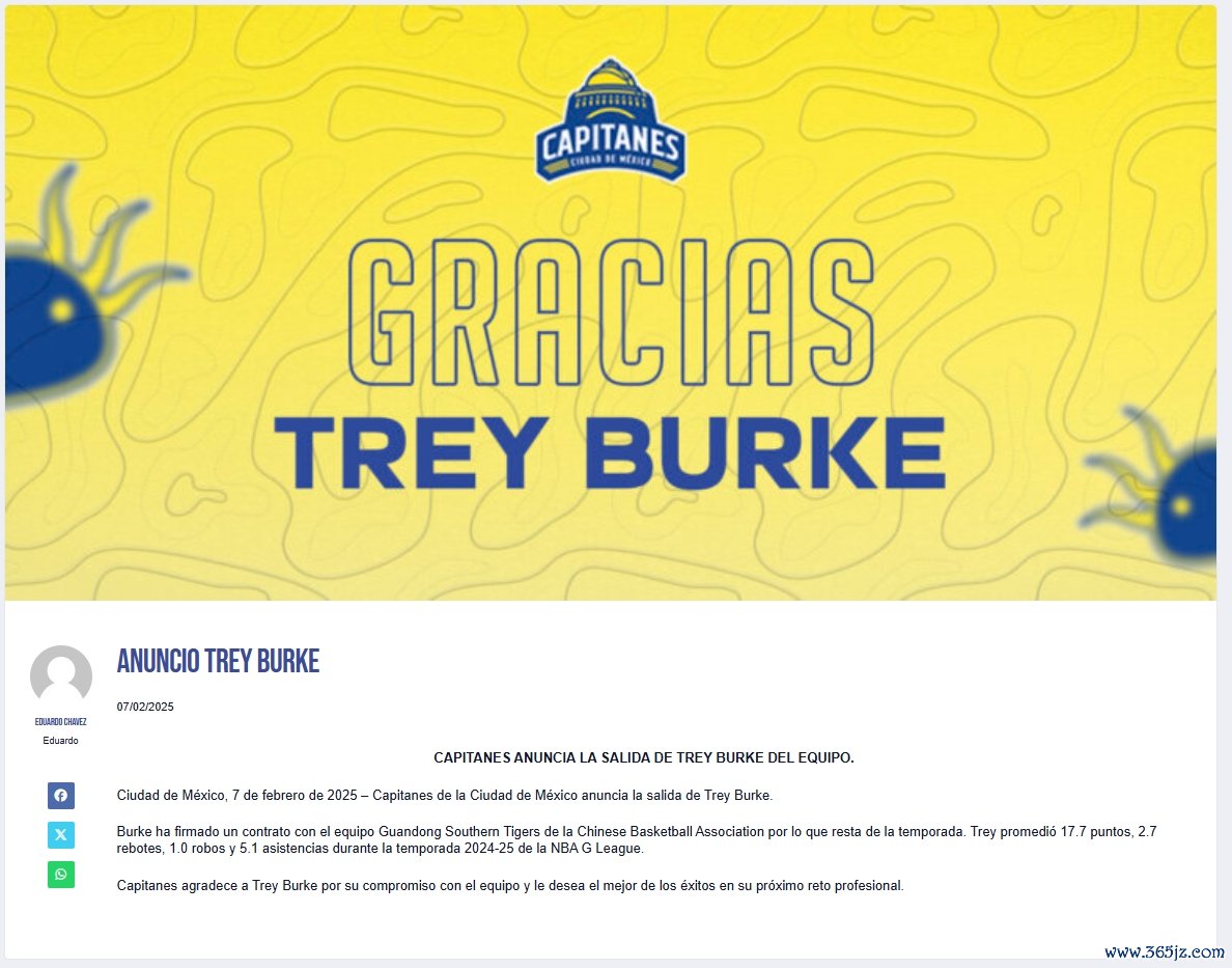 02月09日讯 G定约墨西哥城队主座方晓谕,特雷-伯克防御离队并与CBA广东宏远男篮签约至赛季戒指。