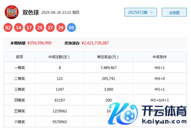 福彩双色球第2025072期开出奖号:02、14、17、25、27、29+05。其中红球012路比为1:1:4,奇偶比为4:2体育赛事直播,三区比为1:2:3,蓝球开出2路奖号。