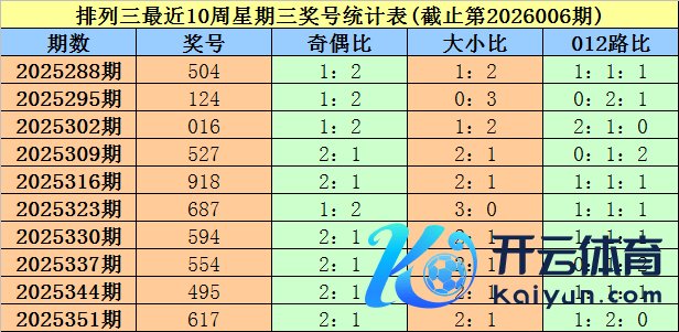 胪列三第2025351期(上周星期三)奖号为617。其中奖号奇偶比为2:1,大小比为2:1,012路比为1:2:0。