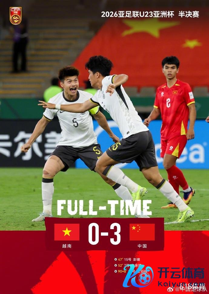 中国队进球王人鄙人半场,第47分钟,21号鲍盛鑫主罚角球开出,15号彭啸门前甩头攻门入彀,u23国足1-0越南!比赛第57分钟,7号向余望回身左脚抽射破门,U23国足2-0逾越!第90+9分钟,9号拜合拉木左路平稳横传,10号王钰栋跟进推射告成,随后脱衣庆祝染黄,u23国足3-0越南!