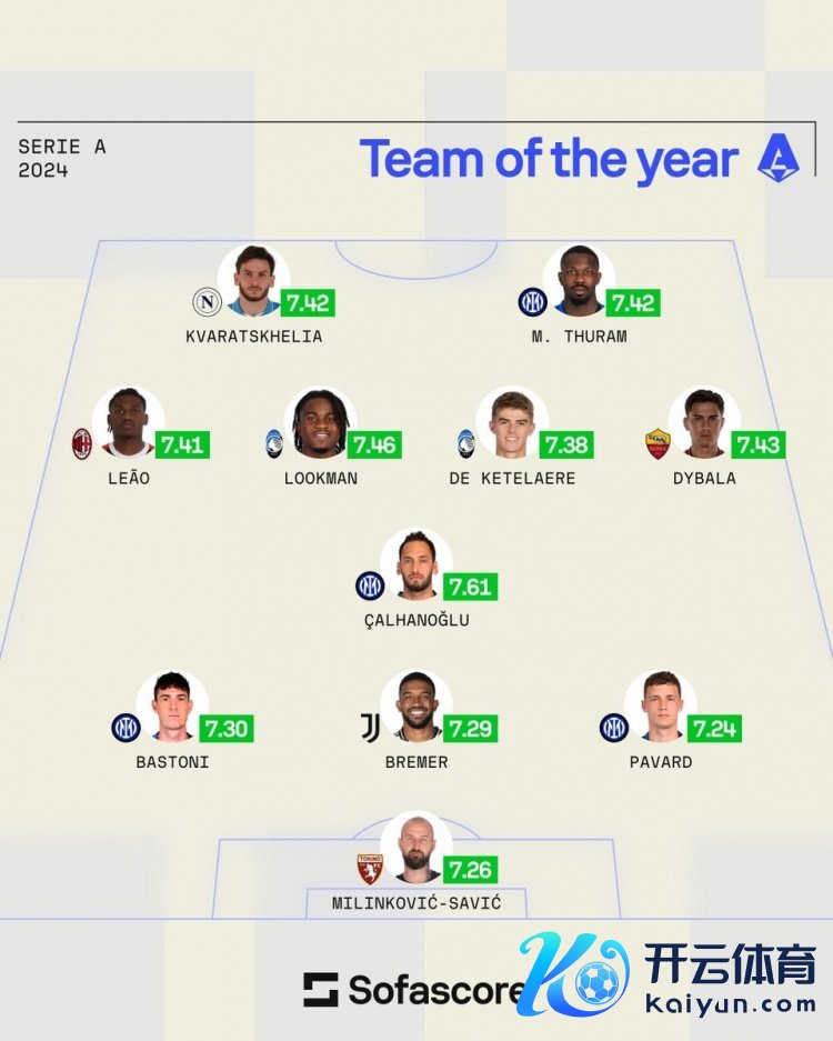 中场:莱奥(米兰,7.41分)、卢克曼(亚特兰大,7.46分)、恰尔汗奥卢(国米,7.61分)、德凯特拉雷(亚特兰大,7.38分)、迪巴拉(罗马,7.43分)