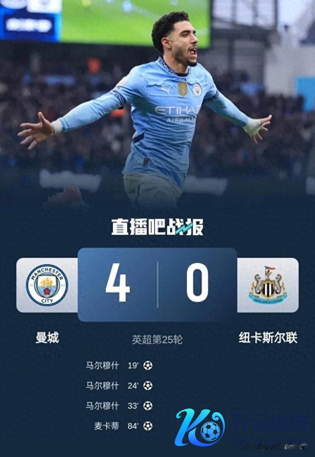 2024-25赛季英超联赛第25轮体育赛事直播,曼城主场迎战纽卡斯尔。这是妖魔赛程第二战辞谢有失,若衰落曼城本赛季注定樗栎庸材,一切成空。上半场曼城攻势如潮,新援马尔穆什单刀破门为曼城领先龙套僵局,随后又连进两球,半场就演出帽子戏法,半场战罢曼城3:0跳动。易边再战曼城连续加强繁多,哈兰德头球摆渡助攻麦卡蒂破门,但随后伤退缩瓜迪奥拉盗汗直流,最终曼城4:0礼服纽卡斯尔,联赛排行升至第四,只过期排行第三的诺丁汉丛林3分,联赛前三有戏!