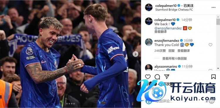 帕尔默社媒晒出与恩佐庆祝进球的合照,配文:“咱们回想了!恩佐🅰️🤝”
