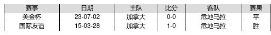 加拿大 VS 危地马拉两队近10年的交战次数为2场,加拿大1胜1平0负,赢球概率为50.0%,平局概率为50.0%,输球概率为0.0%。