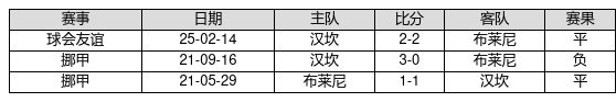布莱尼 VS 汉坎两队近10年的交战次数为3场,布莱尼0胜2平1负,赢球概率为0.0%,平局概率为66.7%,输球概率为33.3%。