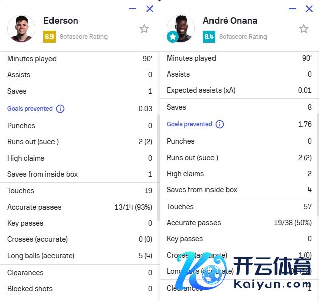 奥纳纳和埃德森本场比赛齐称得上告捷,前者透澈参加和专注,作念出了一些机灵的响应和扑救,他莫得期间思太多,也莫得期间作念任何愚蠢的事,不错说是场上最好的球员。