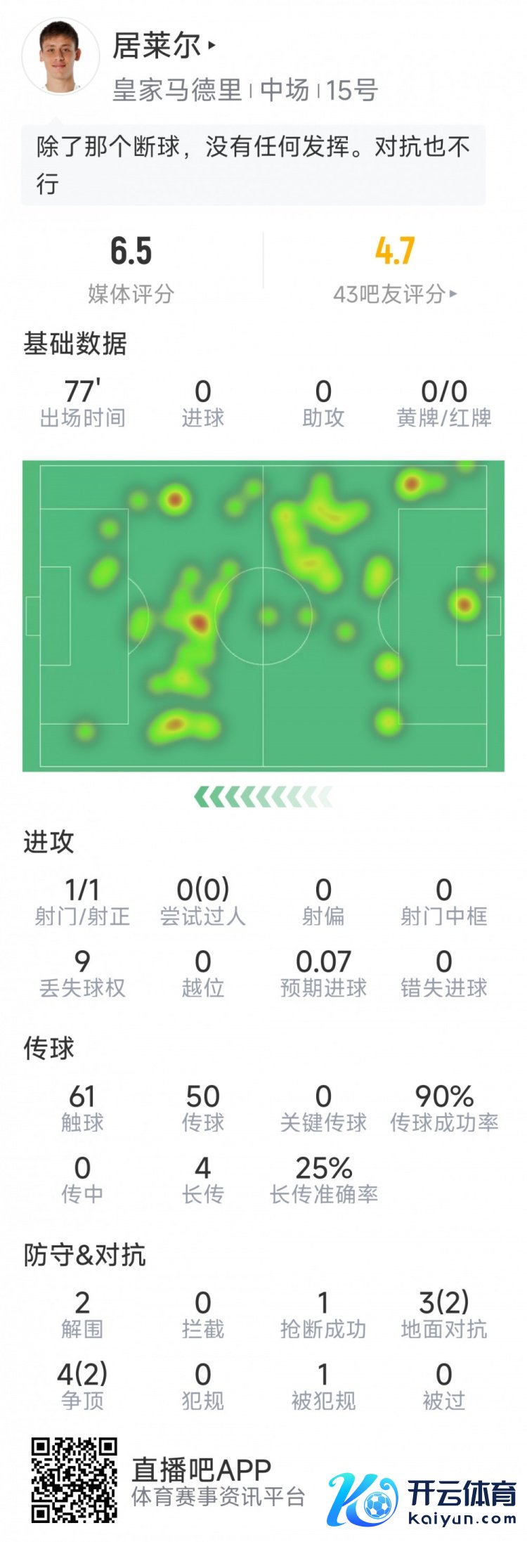 11月5日讯 在本轮欧冠皇马对利物浦的比赛中,居莱尔被替换下场以下为他在本场数据: