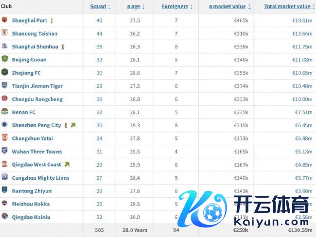 你的位置:bt买球站-bet买球网-bat365球盘-TVT体育足球-新2体育买球-365beat让球-365beat压球网-bet36比分最新-2025欧洲杯买球网-eb007买球_体讯环球通捷报 > 体育最新信息 >中超俱乐部身价名次如下(欧元): 1、上海海港 1861万 2、山东泰山 1364万 3、上海申花 1175万 4、北京国安 1108万 5、浙江队 1065万 6、天津津门虎 1048万 7、成皆蓉城 1000万 8、河南队 751万 9、深圳新鹏城 645万 10、长春亚泰 588万 11、武汉三镇 513万 12、青岛西海岸 485万 13、沧州雄狮 377万 1